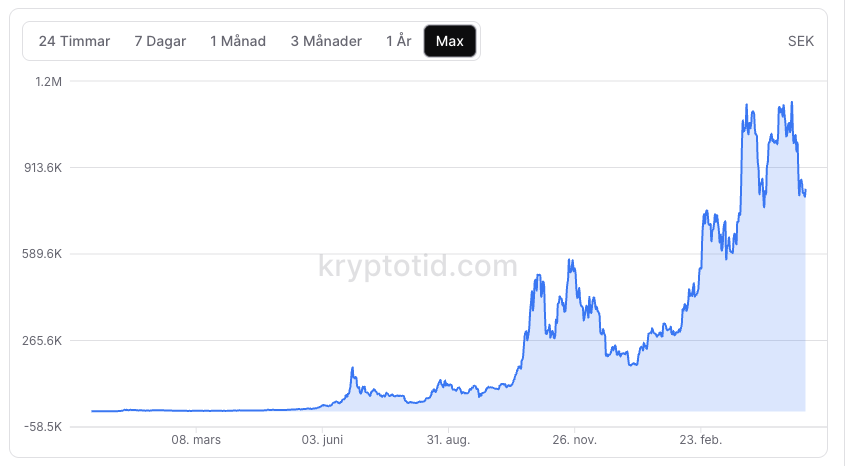 För att räkna om själv: ta Bitcoin-priset i dollar och multiplicera med aktuell USD/SEK-kurs (ligger runt 10-11 kr per dollar).